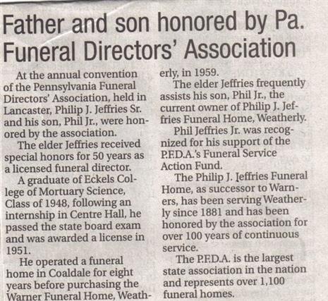 This transition has significant history . Phil Jeffries Sr. and his brother David both got their start in funeral service in the late 1930's working for Sank's grandfather at his Tamaqua funeral home while they were in high school. David bought his funeral home in Centre Hall, PA after WW II and Phil Sr. opened his first funeral home in Coaldale, PA in 1950.